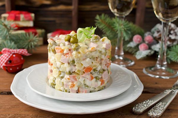 Il piatto di Capodanno più tradizionale è l’insalata di Olivier (famoso in Italia come Insalata russa). La ricetta originale consisteva interamente di altri ingredienti, tuttavia, nel periodo sovietico non molto ben nutrito, era impossibile trovarli. Le donne sovietiche sostituirono semplicemente questi prodotti con quelli più economici e convenienti. Ad esempio, i gamberi sono stati sostituiti con carote bollite.
