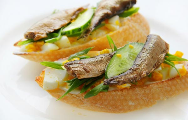 Ingredienti: pane tostato, sprattus, cetriolo salato, cipolle verdi.