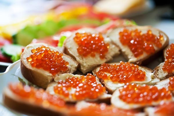 Un elemento importante sulla tavola delle feste è uno spuntino con pesce rosso e caviale, che per molti russi sono un simbolo del nuovo anno. Semplici panini con pesce rosso e formaggio cremoso decoreranno qualsiasi tavolo, dandogli solennità. Per la loro preparazione viene usato il salmone o la trota.