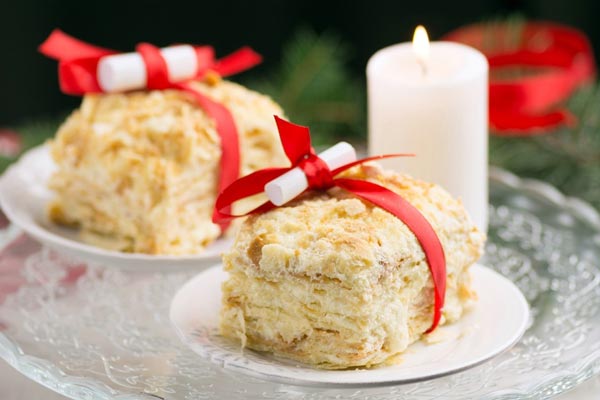 Torta Napoleone è un dessert incomparabile di pasta sfoglia non zuccherata con crema pasticcera, è molto amata dai russi, proviene dalla Francia. In Italia è conosciuta come la torta millefoglie.
